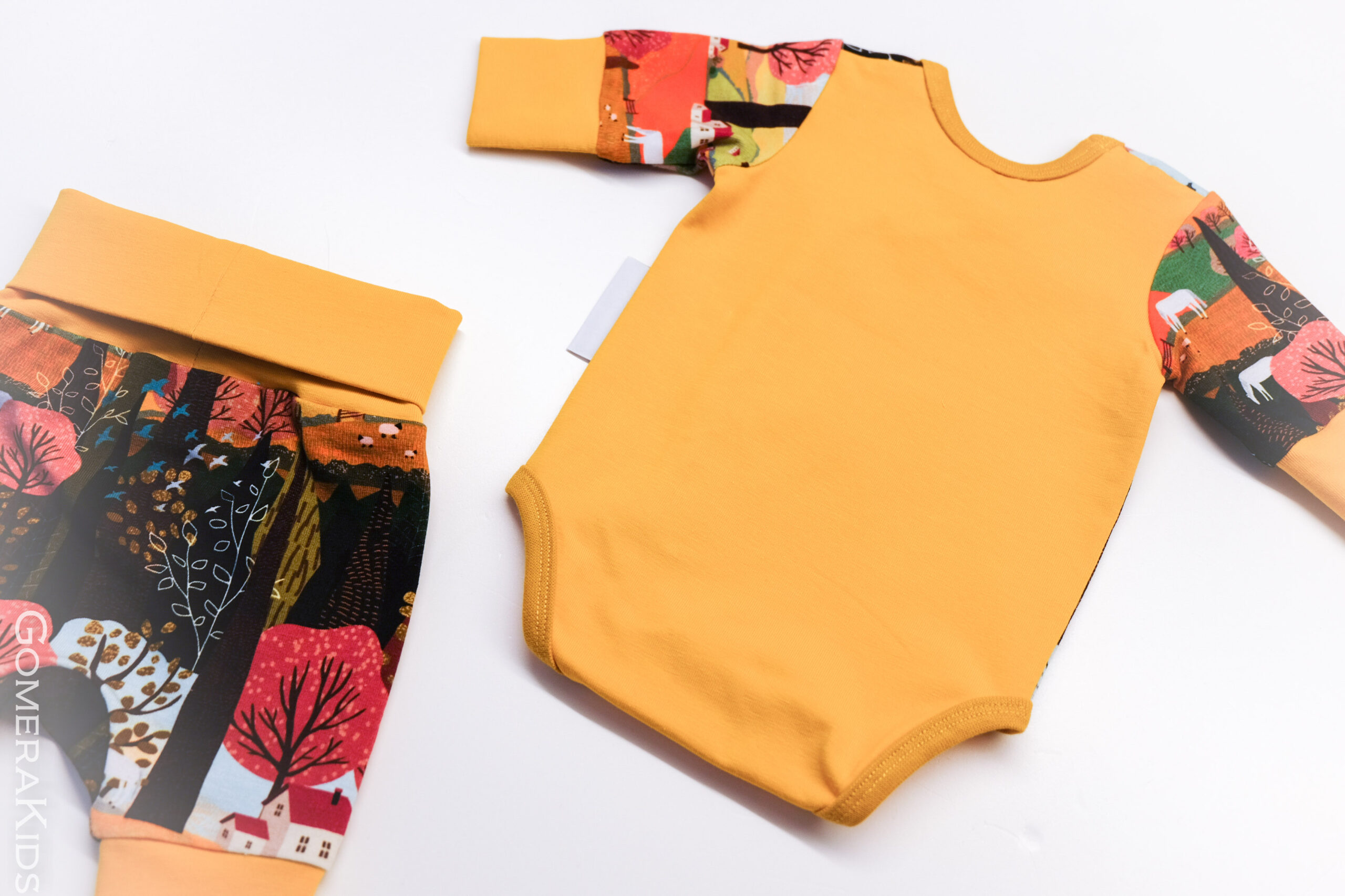 Komplekti kuuluvad eest trukkidega avatav bodi ning mugavad püksid. Bodi detailid on pehmest sinepikollasest ja mustrilisest puuvillatrikotaažist. Läbimõeldud lõige ja elastne materjal tagavad liikumisvabaduse ning õrna sobivuse väikesele kehale.