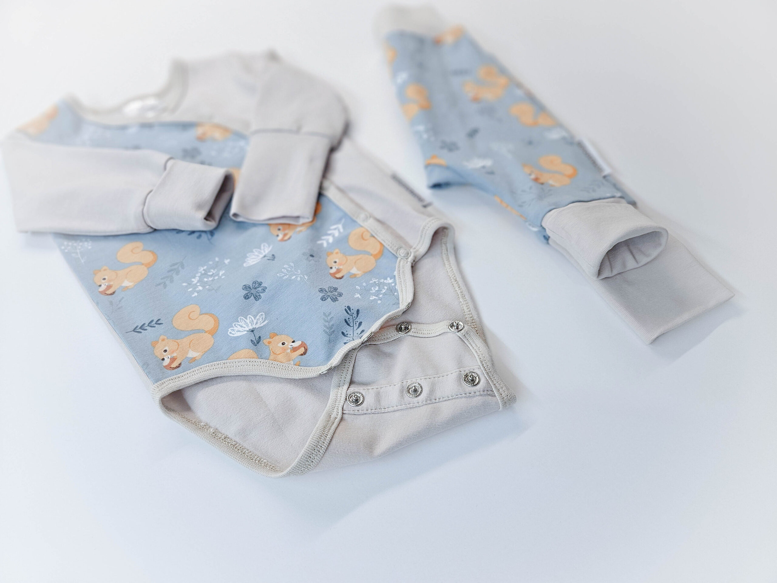 Kasva-minuga disain: Bodyl ja pükstel on spetsiaalsed pikendatavad detailid (mansetid ja topelt-trukid), tänu millele kestab komplekt oluliselt kauem kui tavapärased beebiriided.