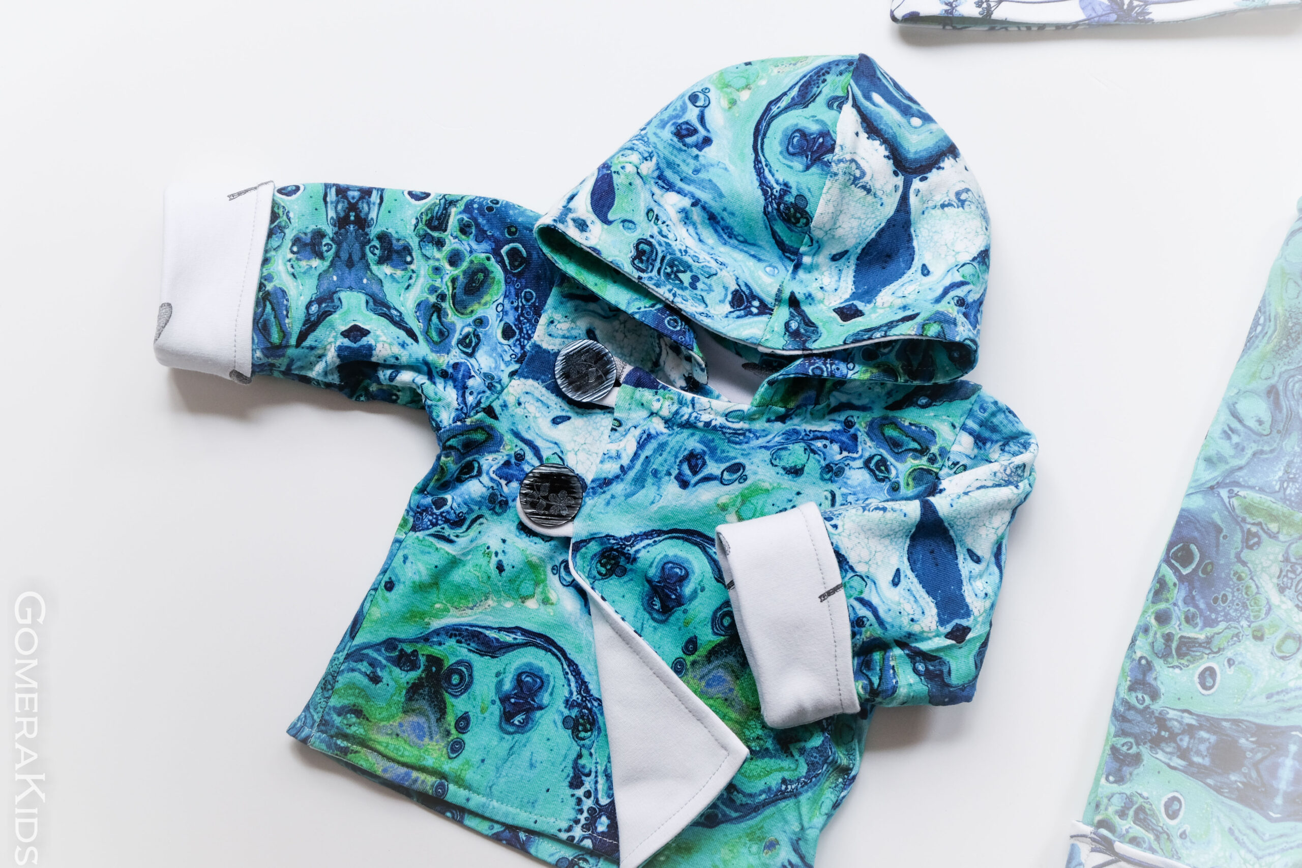 Komplekti kuuluvad õlatrukkidega traksipüksid, nööpidega kinnitatav jakike ning sõlmega mütsike. Jakil ja pükstel on varrukate ja säärte otsad disainitud nii, et neid saab alguses tagasi keerata ja vajadusel hiljem pikemaks lasta. Ka mütsi äärt on võimalik soovi korral tagasi keerata.